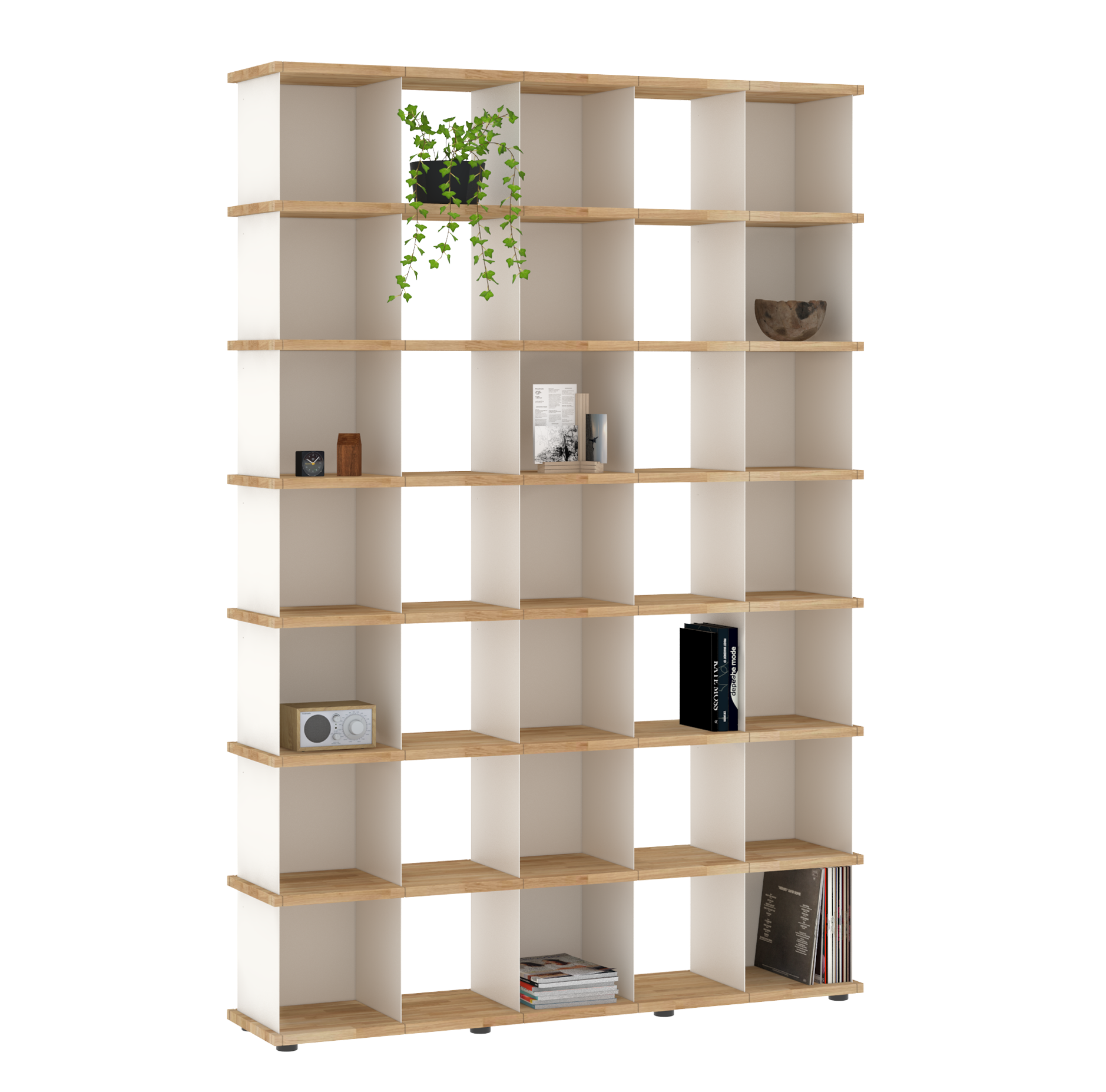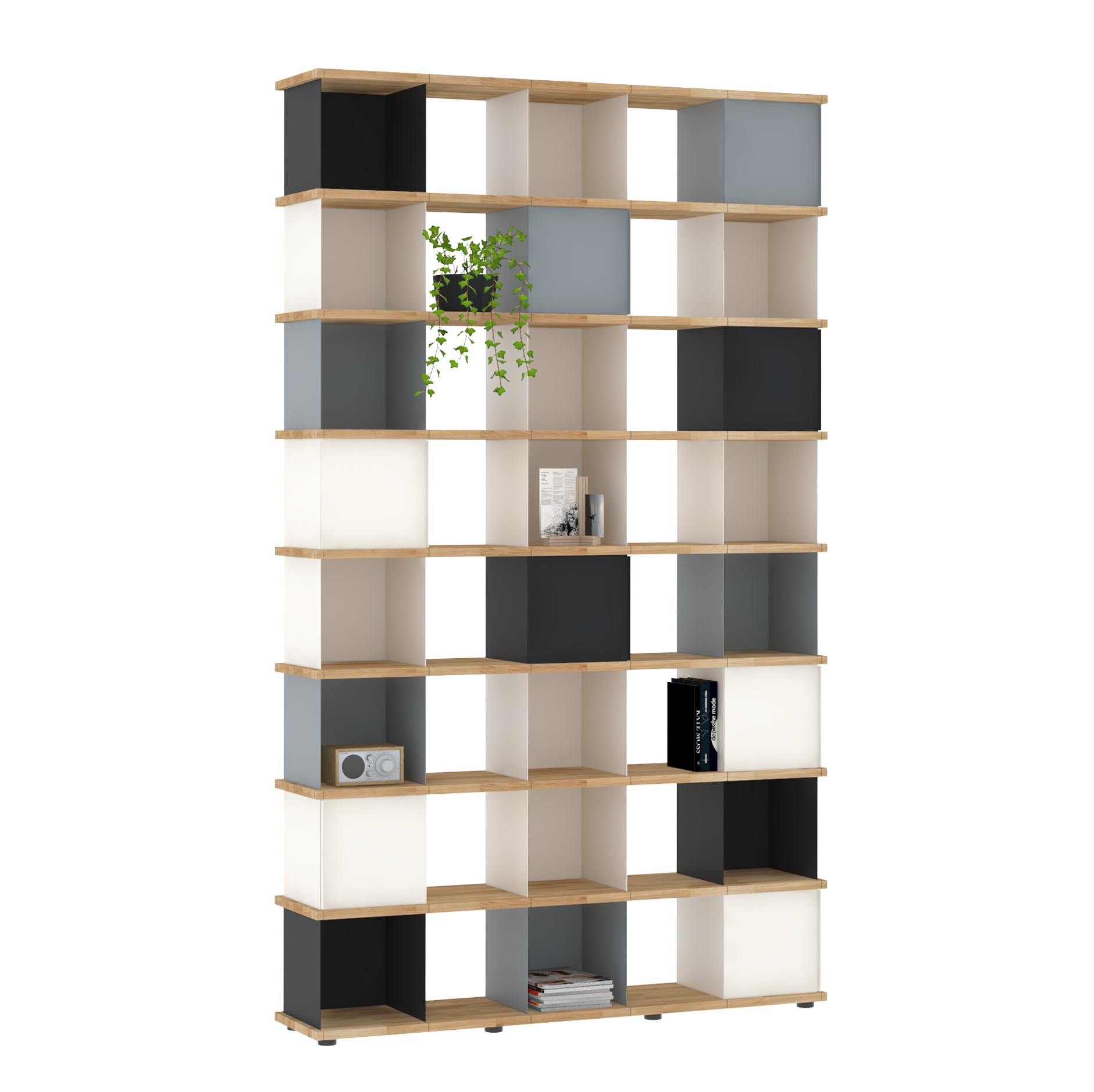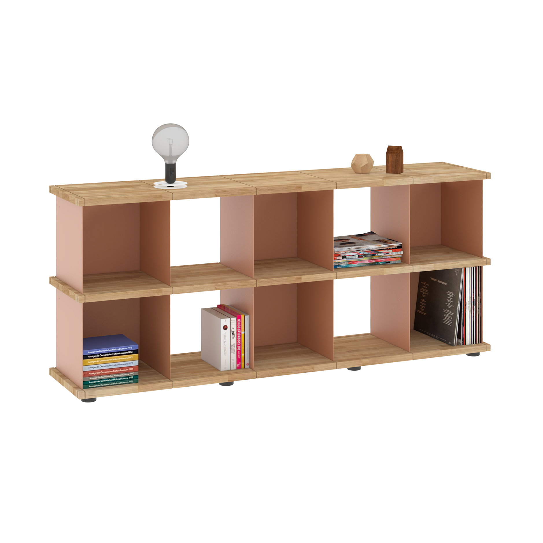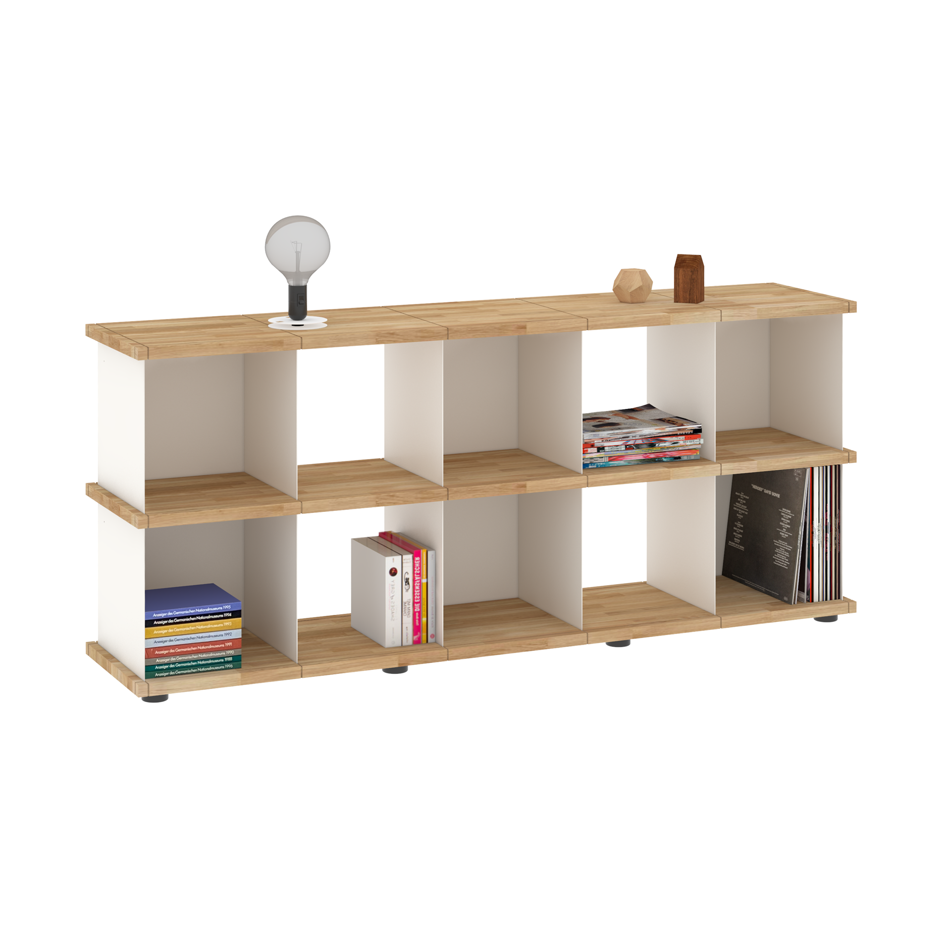 Da sich die Fächer in allen Richtungen in die Nuten der Böden einsetzen lassen, sind die Möbel allseitig und auch wandunabhängig nutzbar. Und dank der verstellbaren Füße an den Sockelböden können Unebenheiten im Fußboden mit einfachen Handgriffen ausgeglichen werden.