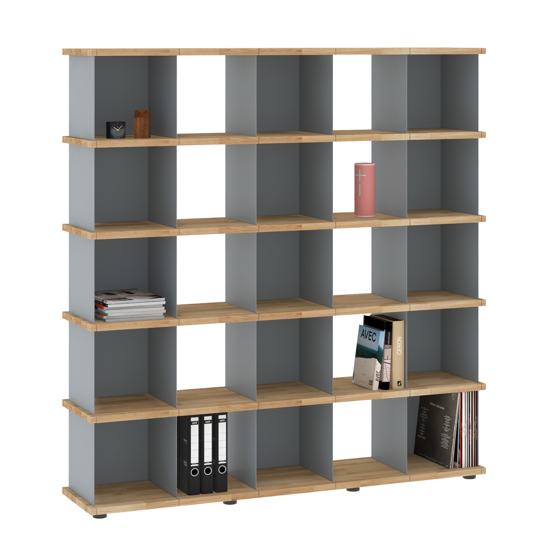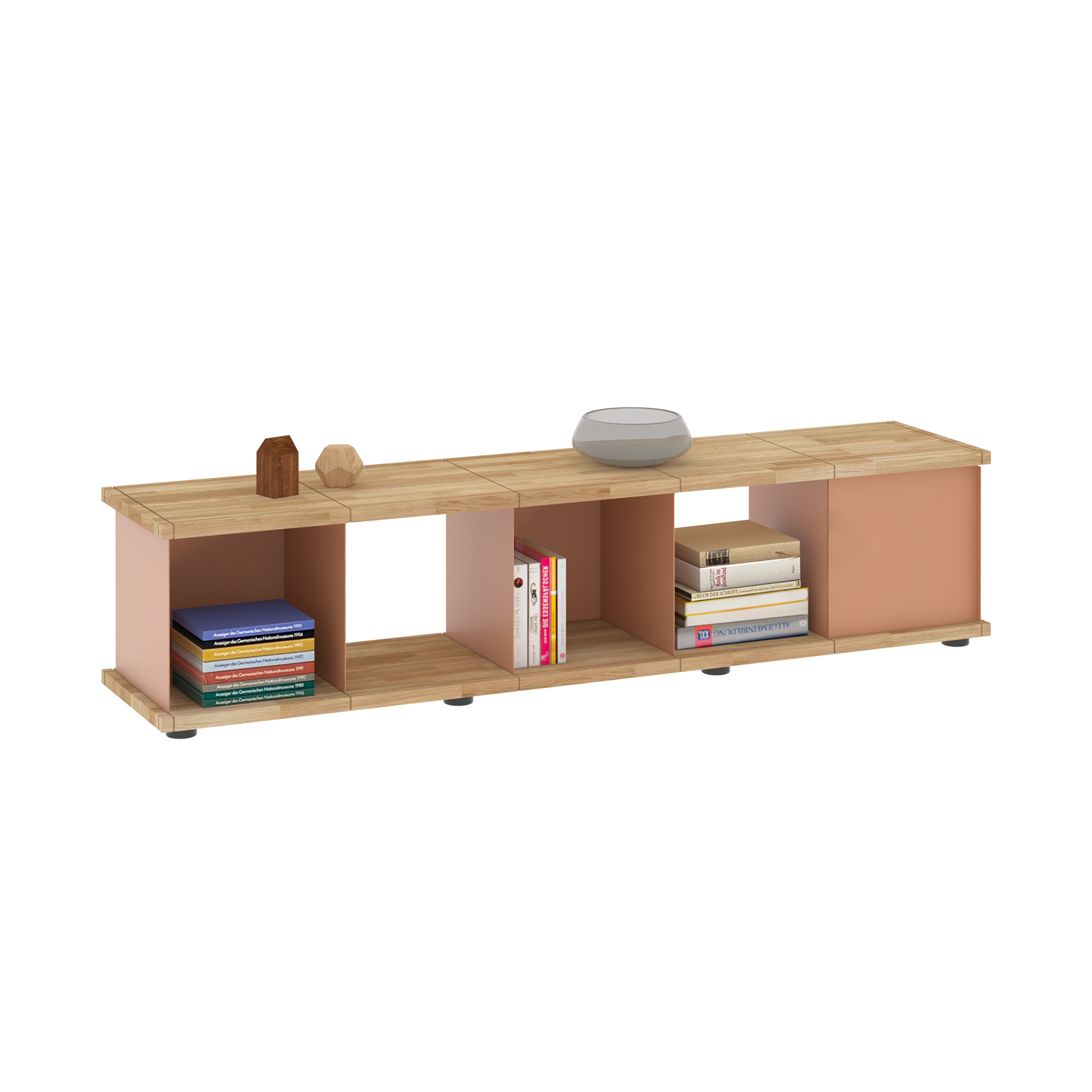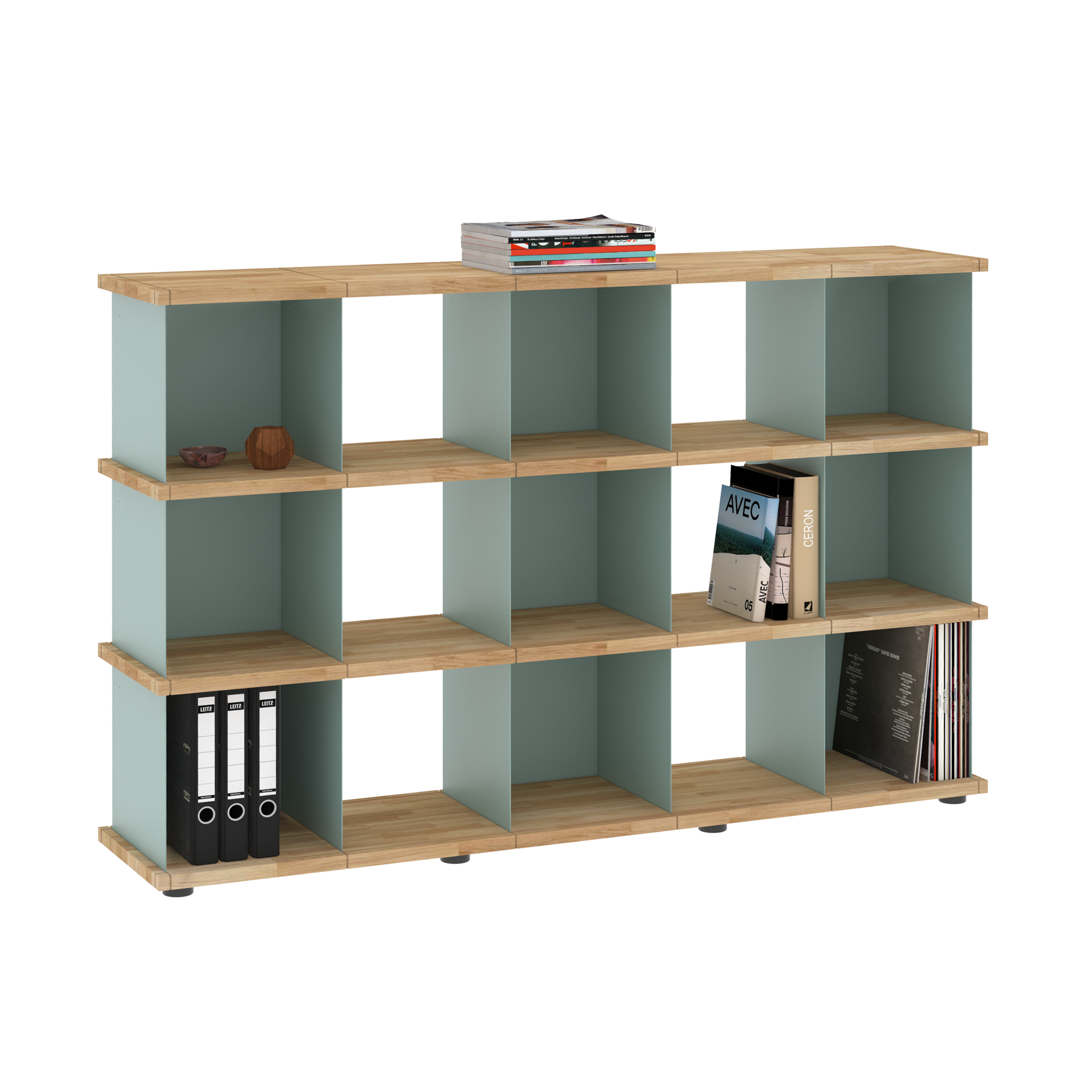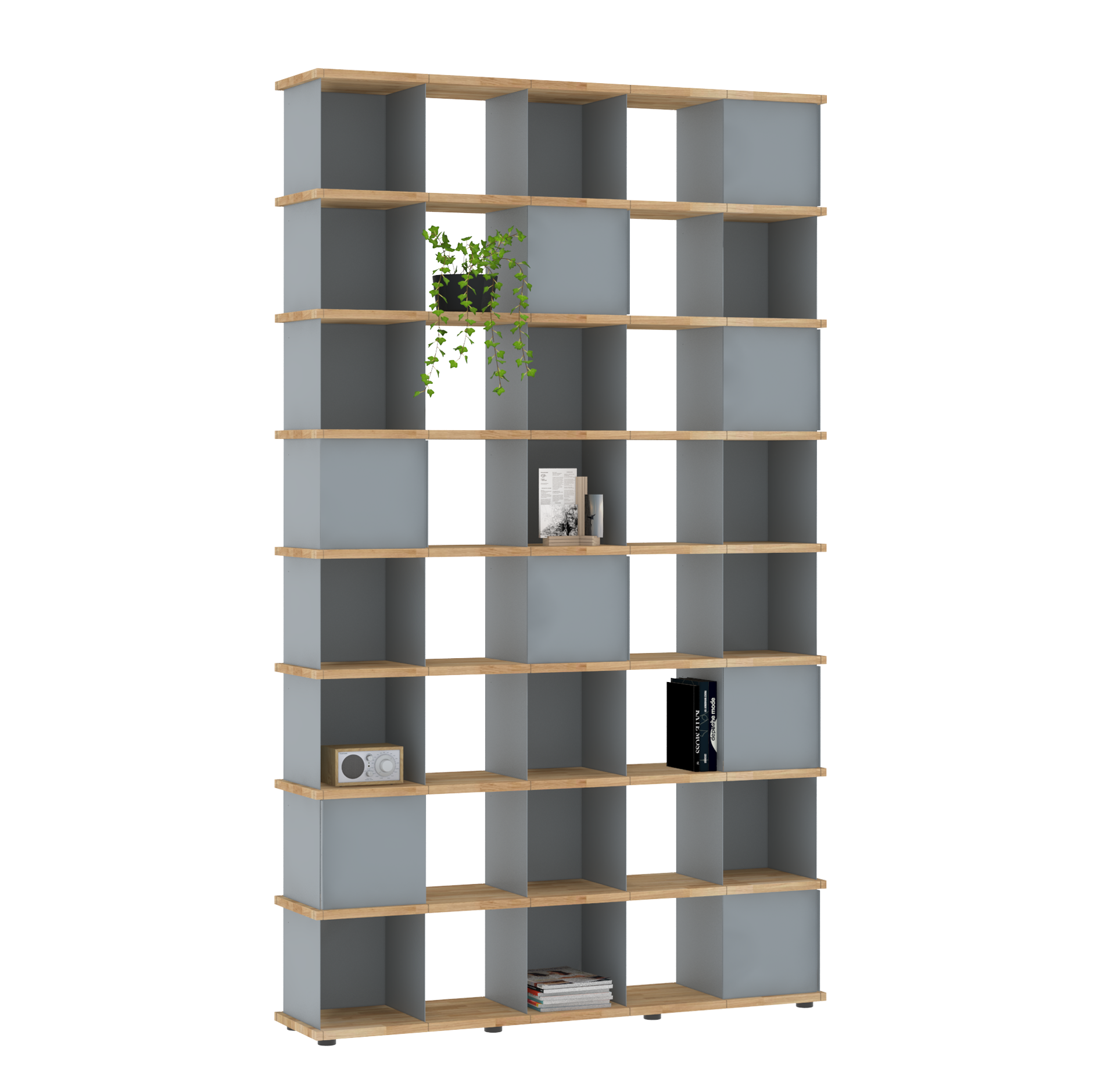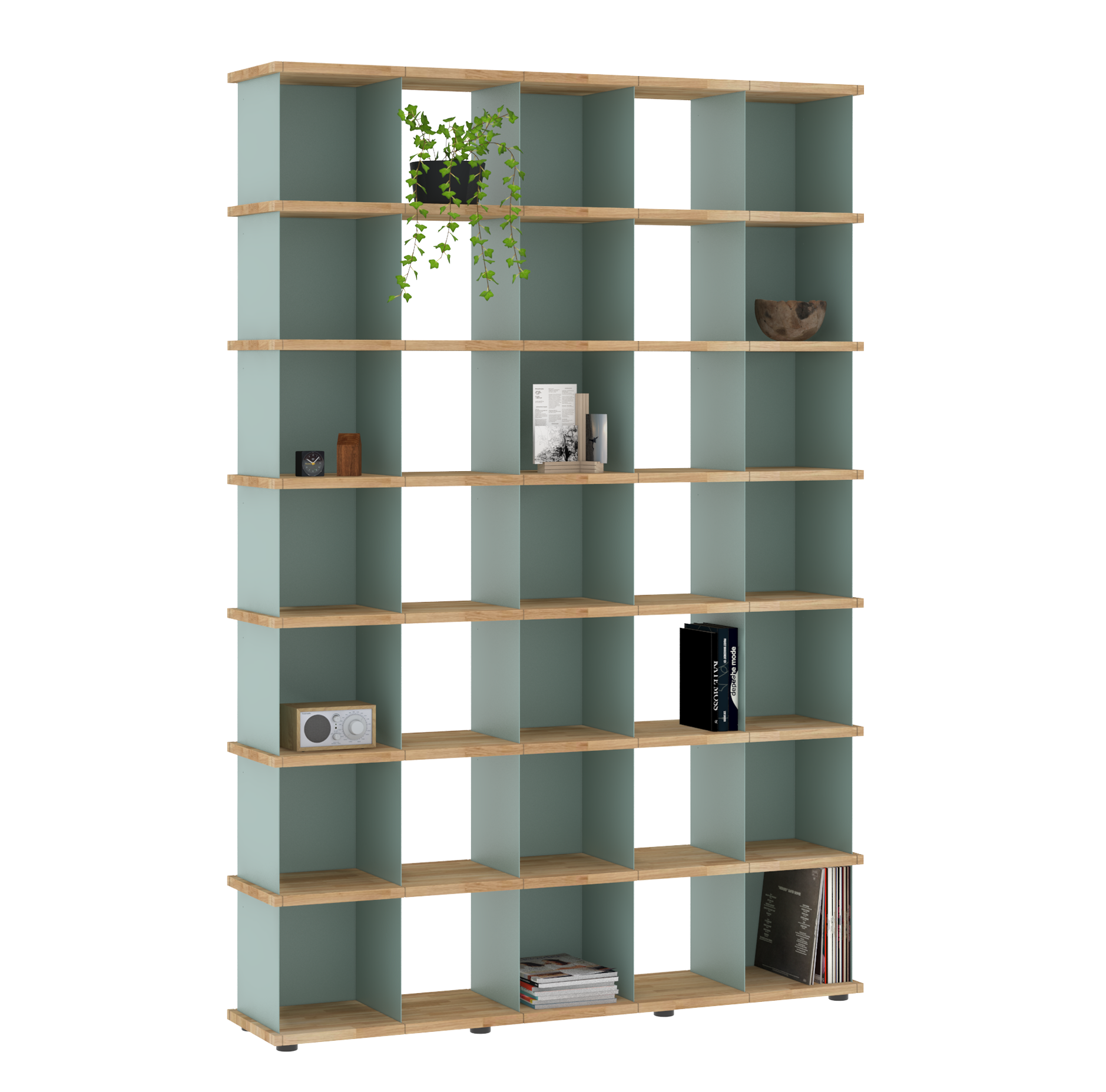 Da sich die Fächer in allen Richtungen in die Nuten der Böden einsetzen lassen, sind die Möbel allseitig und auch wandunabhängig nutzbar. Und dank der verstellbaren Füße an den Sockelböden können Unebenheiten im Fußboden mit einfachen Handgriffen ausgeglichen werden.