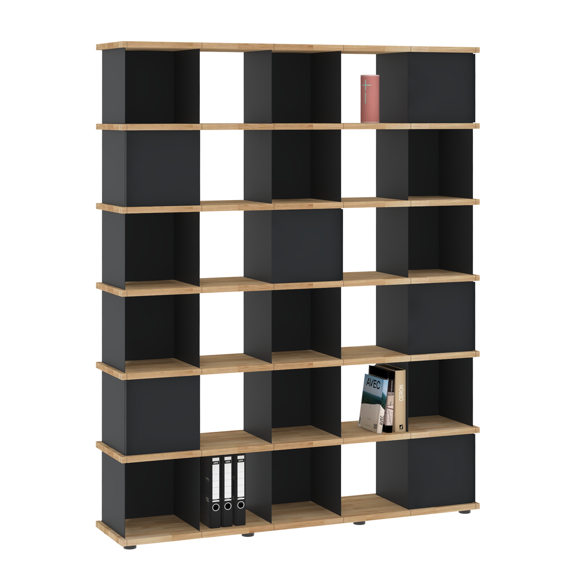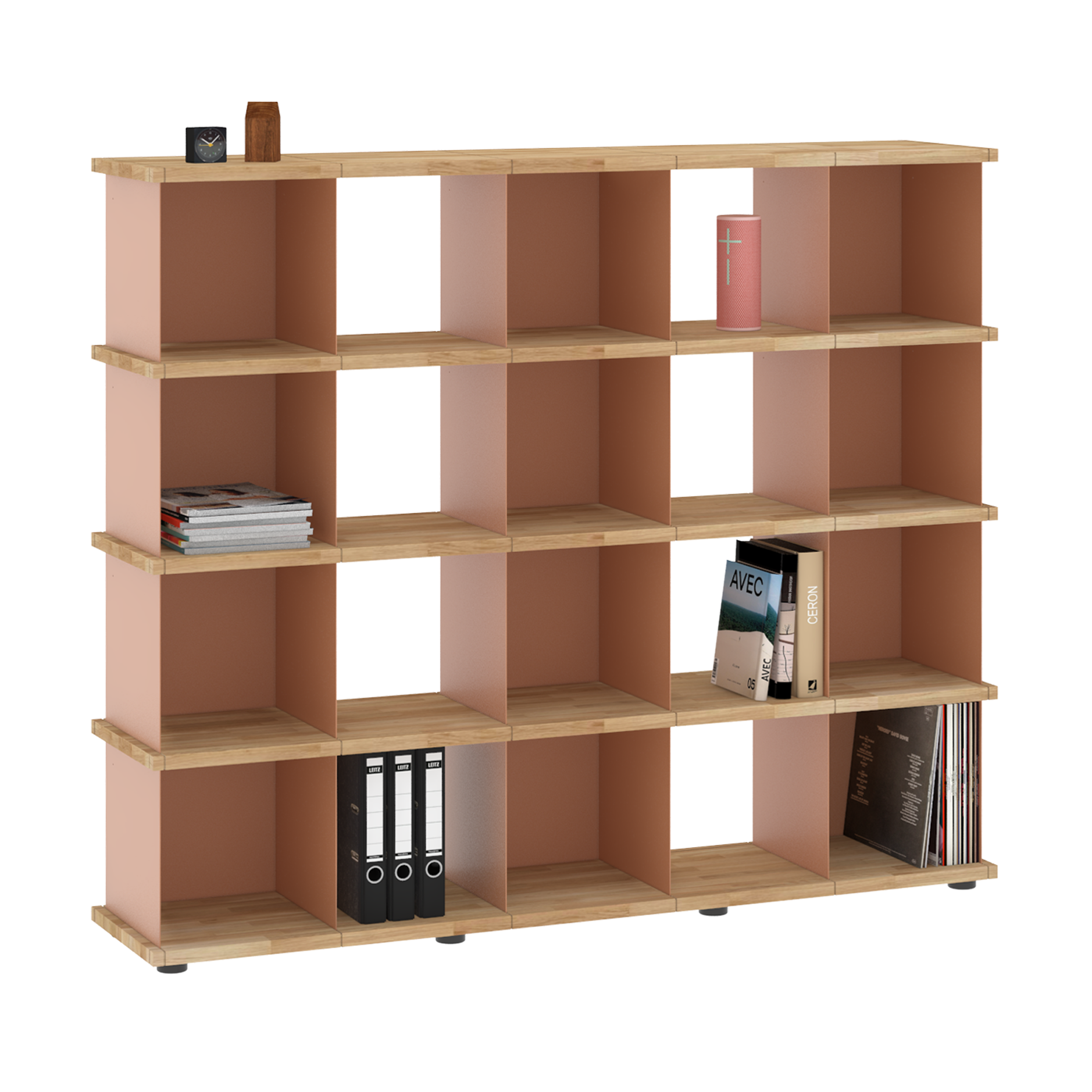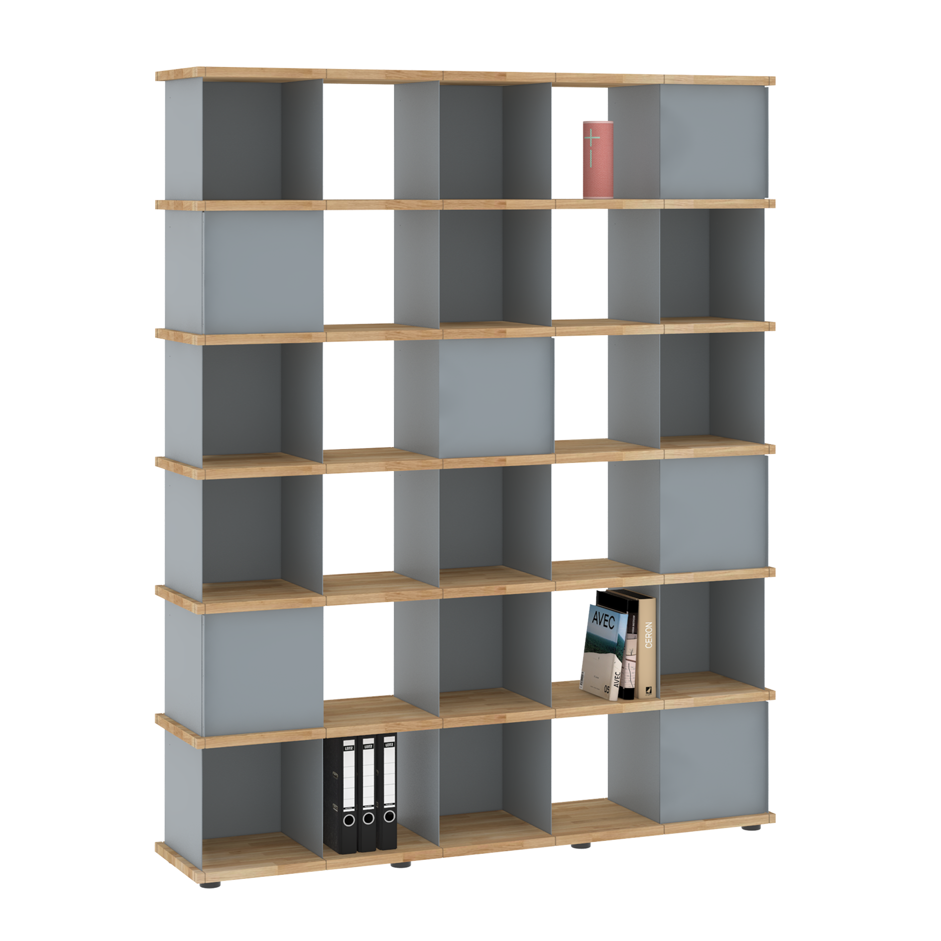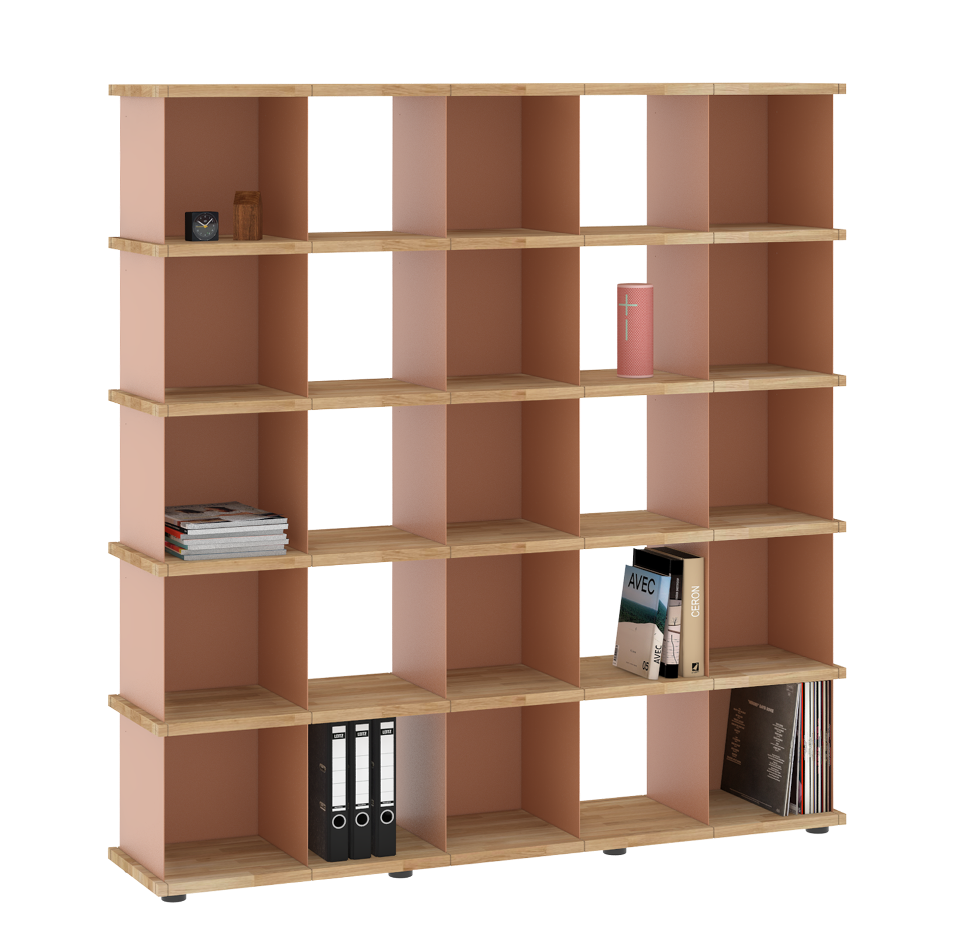 Da sich die Fächer in allen Richtungen in die Nuten der Böden einsetzen lassen, sind die Möbel allseitig und auch wandunabhängig nutzbar. Und dank der verstellbaren Füße an den Sockelböden können Unebenheiten im Fußboden mit einfachen Handgriffen ausgeglichen werden.