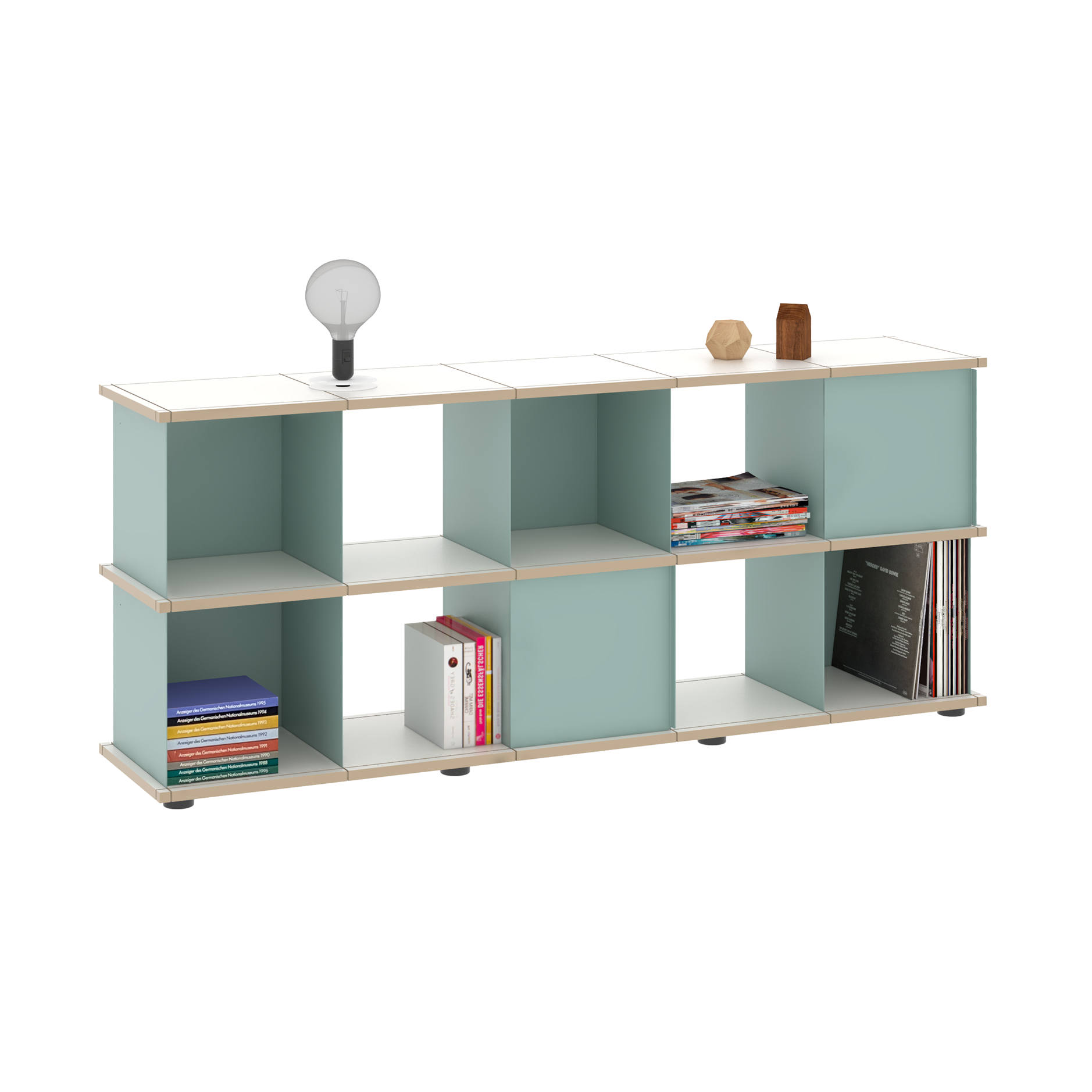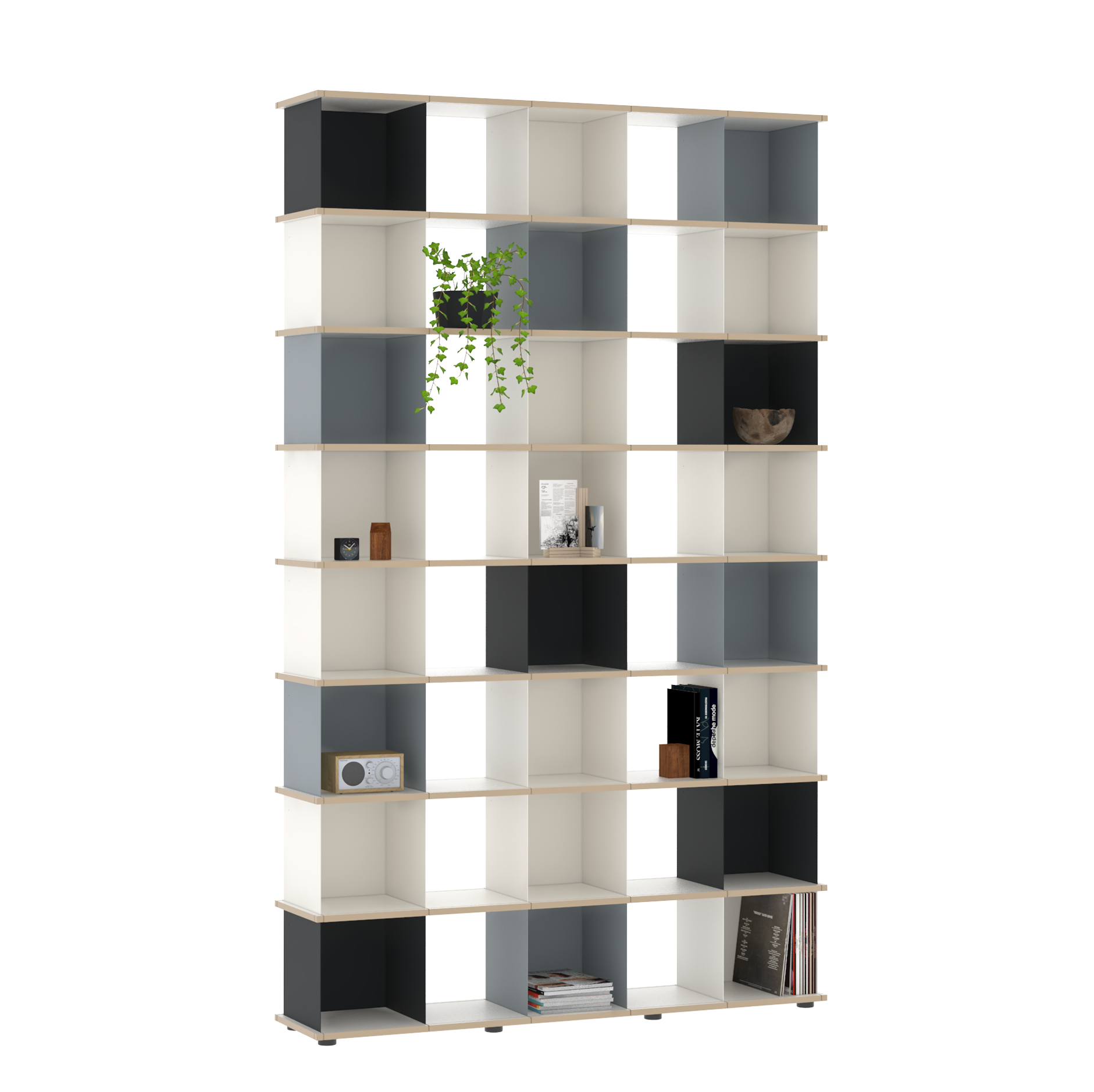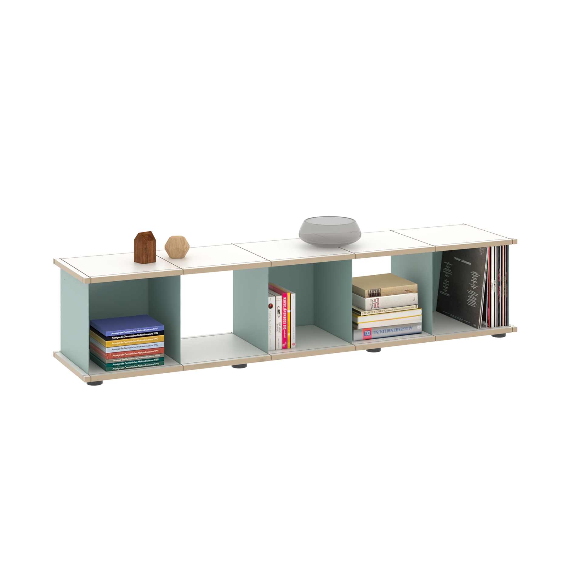 Da sich die Fächer in allen Richtungen in die Nuten der Böden einsetzen lassen, sind die Möbel allseitig und auch wandunabhängig nutzbar. Und dank der verstellbaren Füße an den Sockelböden können Unebenheiten im Fußboden mit einfachen Handgriffen ausgeglichen werden.