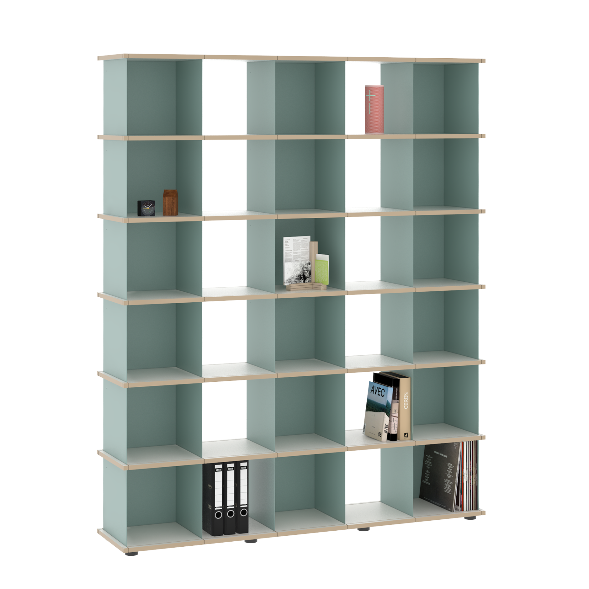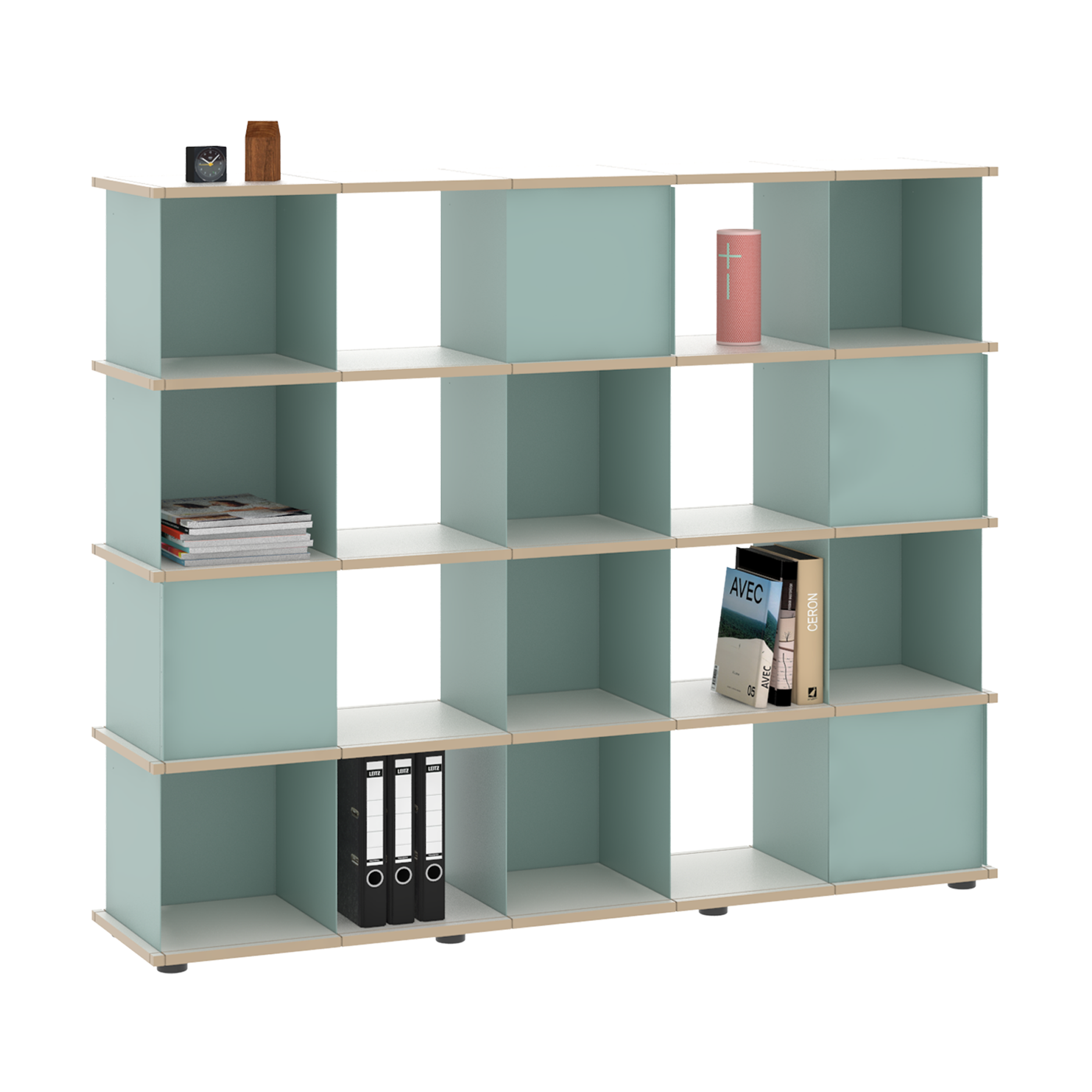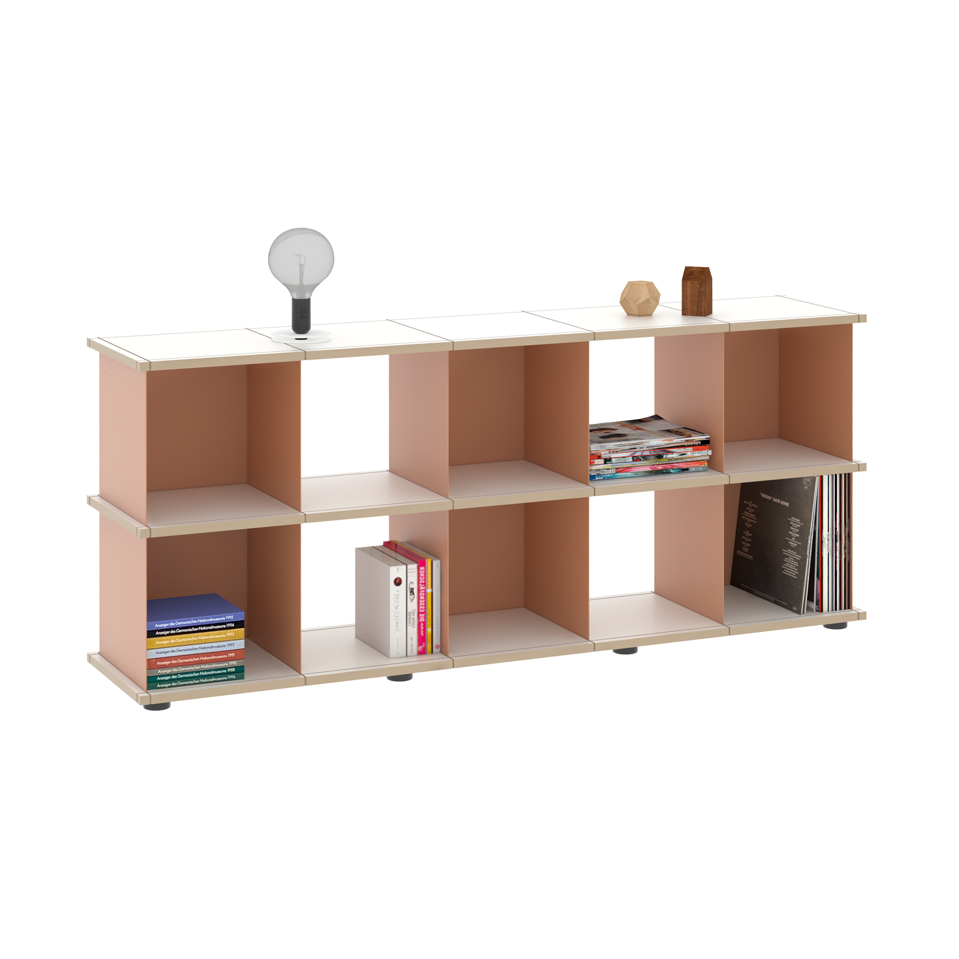 Da sich die Fächer in allen Richtungen in die Nuten der Böden einsetzen lassen, sind die Möbel allseitig und auch wandunabhängig nutzbar. Und dank der verstellbaren Füße an den Sockelböden können Unebenheiten im Fußboden mit einfachen Handgriffen ausgeglichen werden.