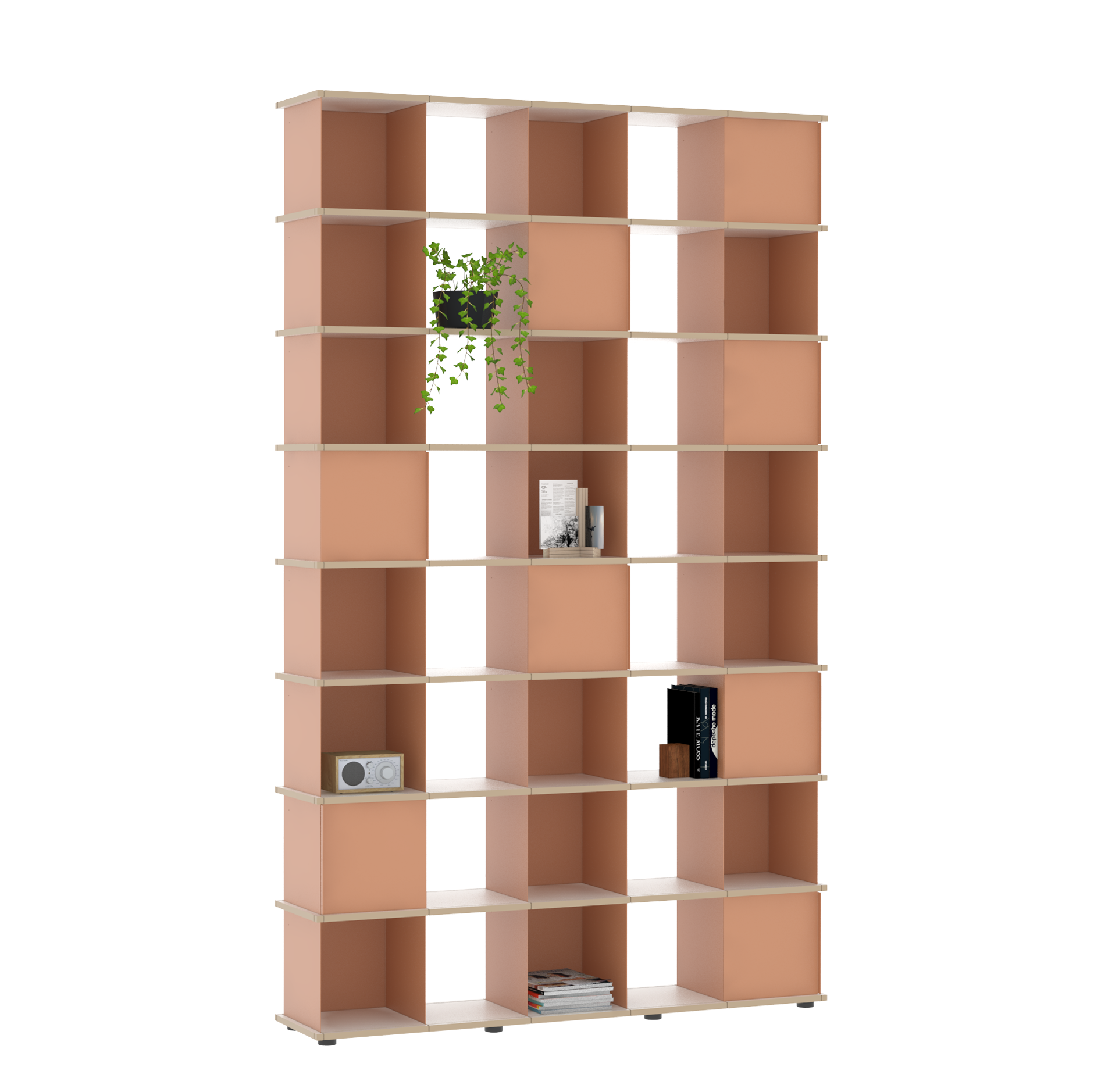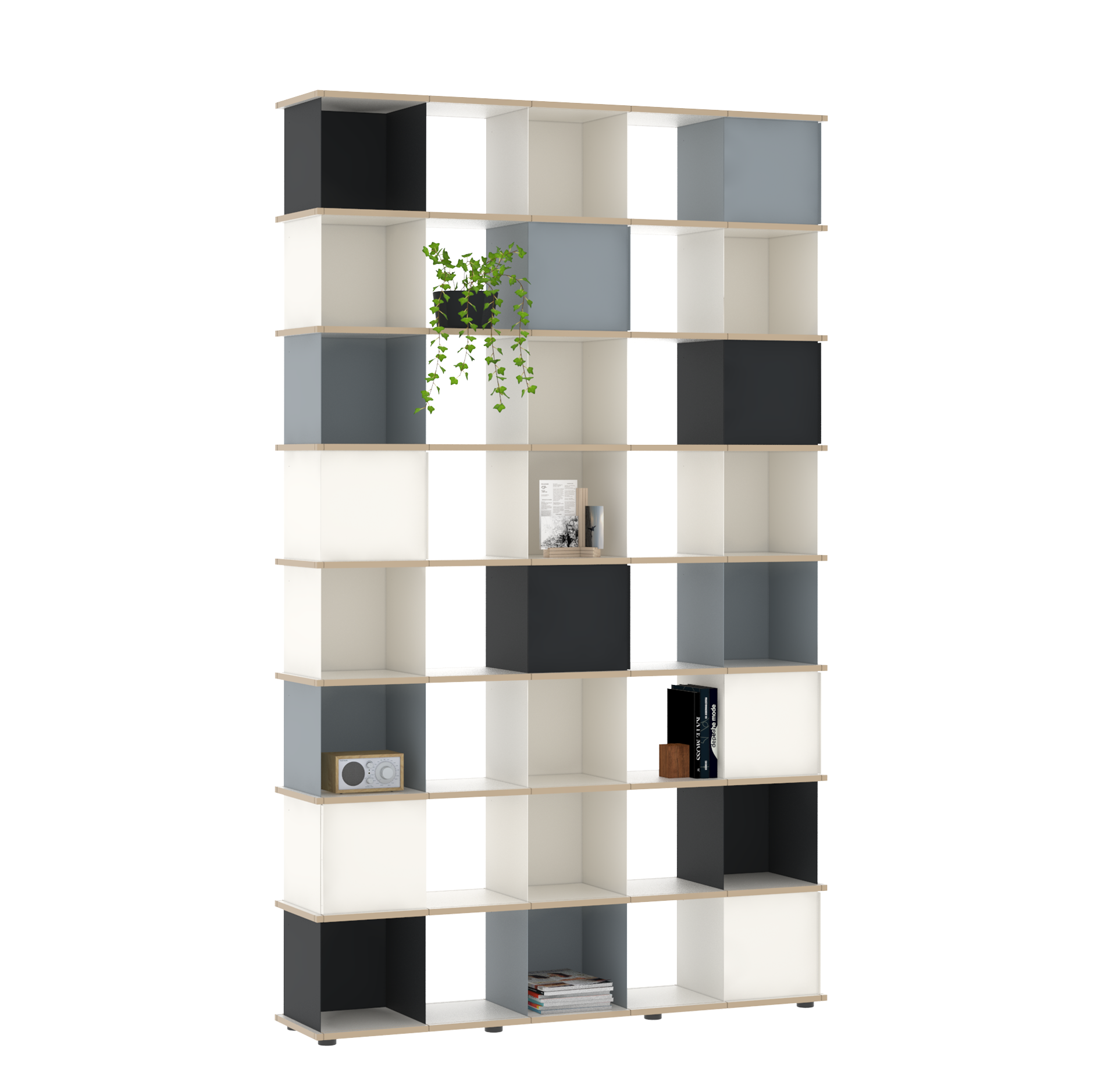 Mit Fächern aus farbig beschichtetem Metall und genuteten Holzböden ist es möglich, vom kleinen Einzelmodul über freistehende Raumteiler bis zur großen Regalwand alles zu bauen. Dafür wird kein Werkzeug benötigt. Man steckt die Regalfächer in der gewünschten Richtung in die Nuten der Böden und baut so Schicht für Schicht in die Höhe.