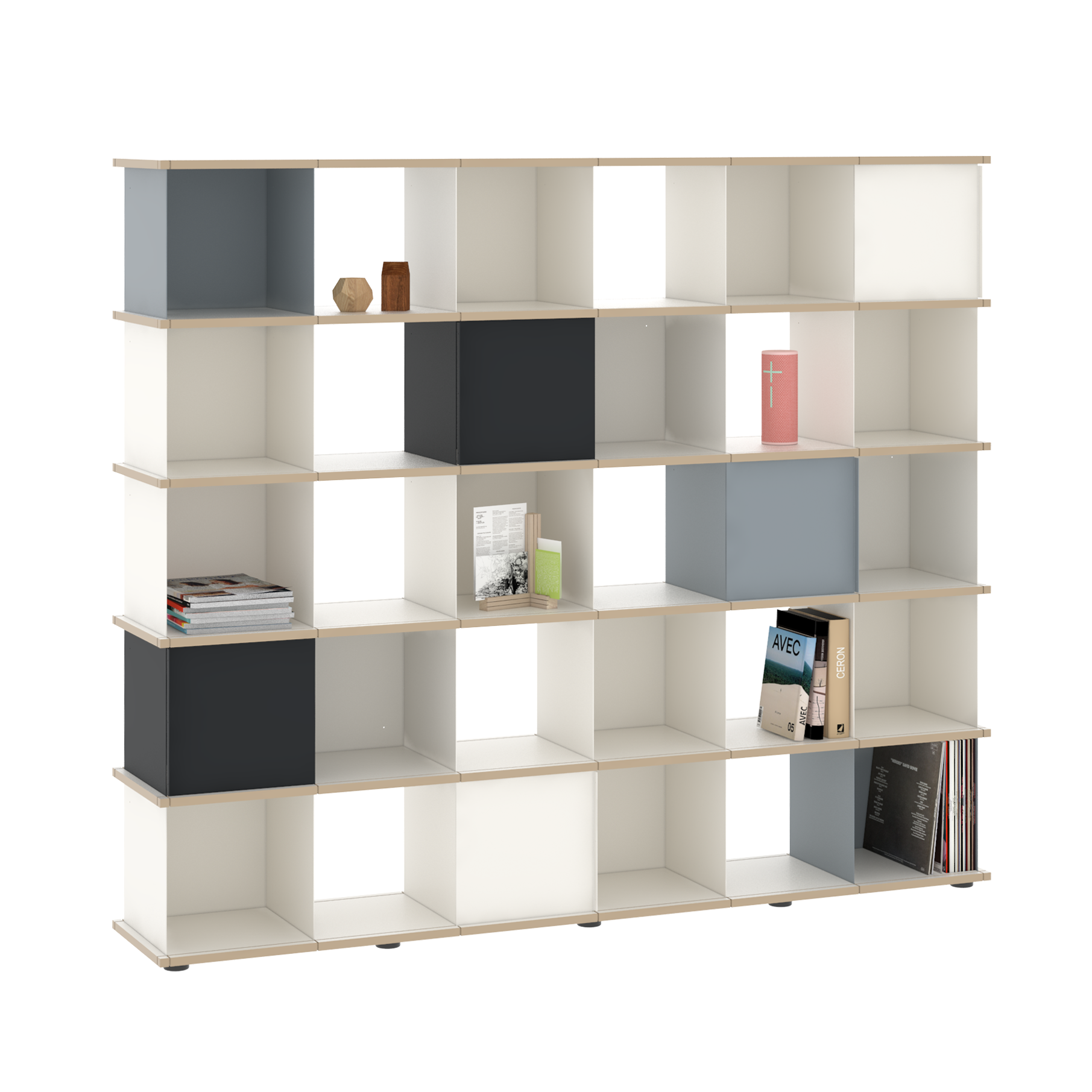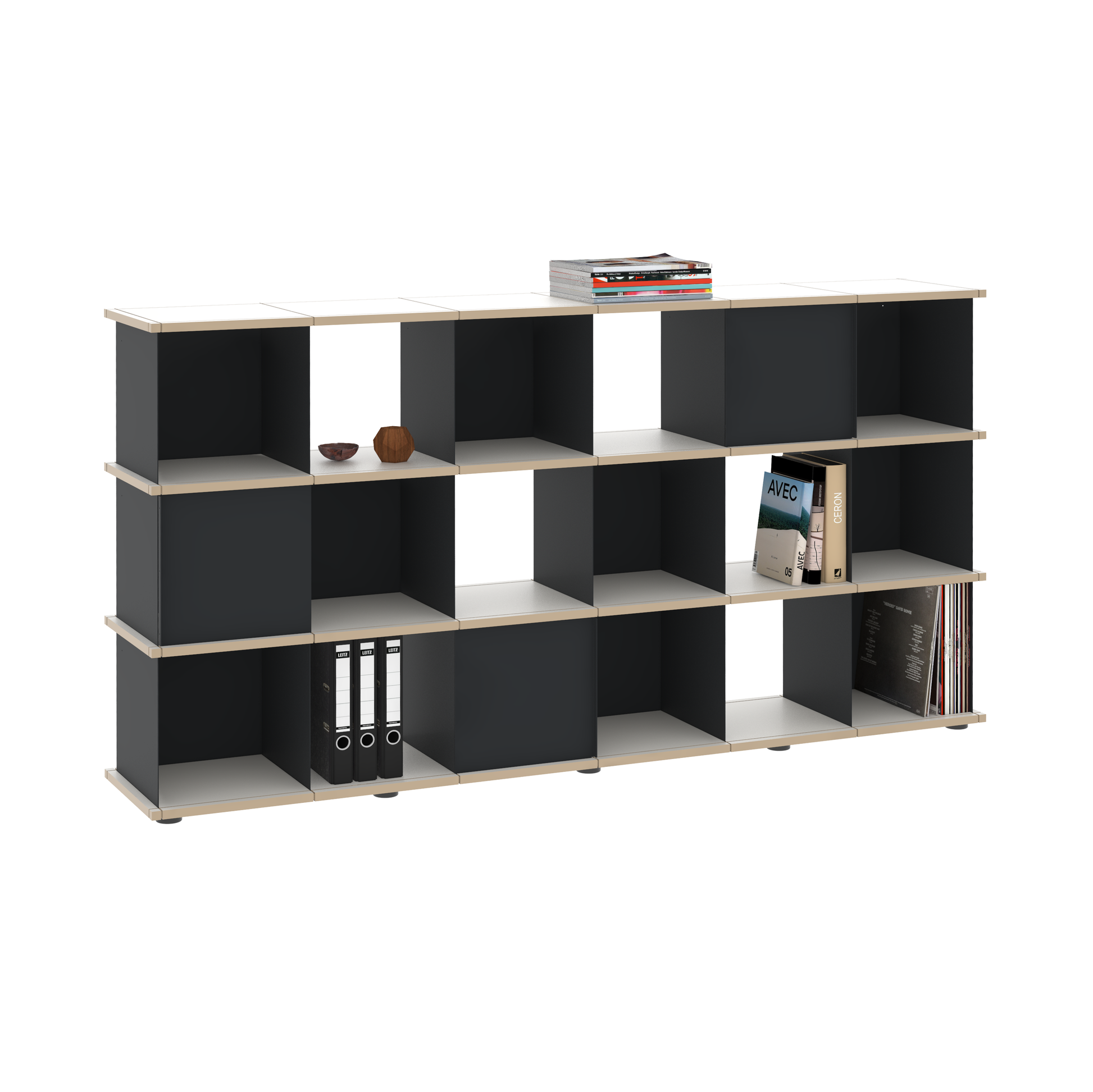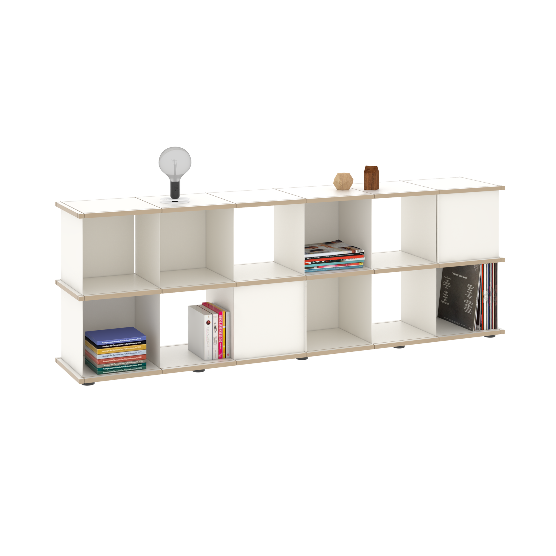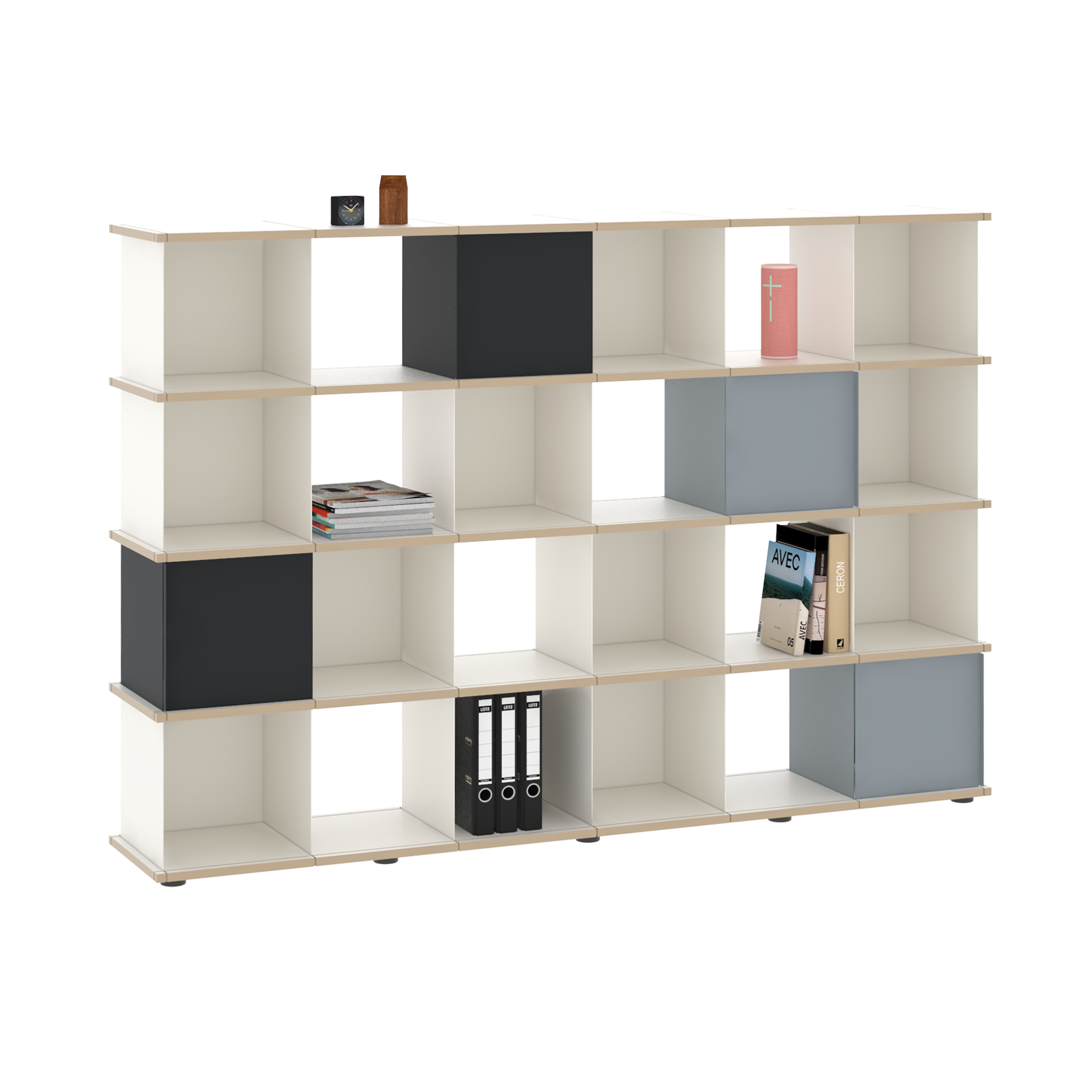 Da sich die Fächer in allen Richtungen in die Nuten der Böden einsetzen lassen, sind die Möbel allseitig und auch wandunabhängig nutzbar. Und dank der verstellbaren Füße an den Sockelböden können Unebenheiten im Fußboden mit einfachen Handgriffen ausgeglichen werden.