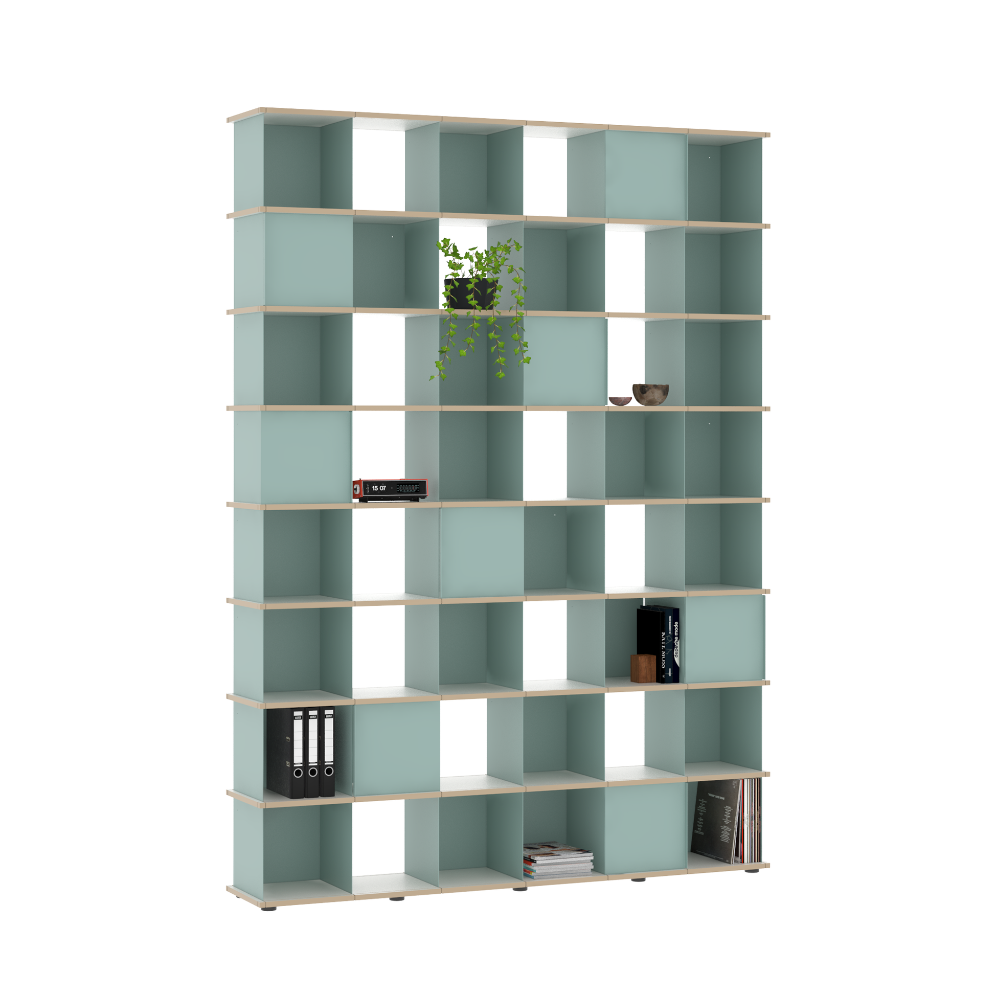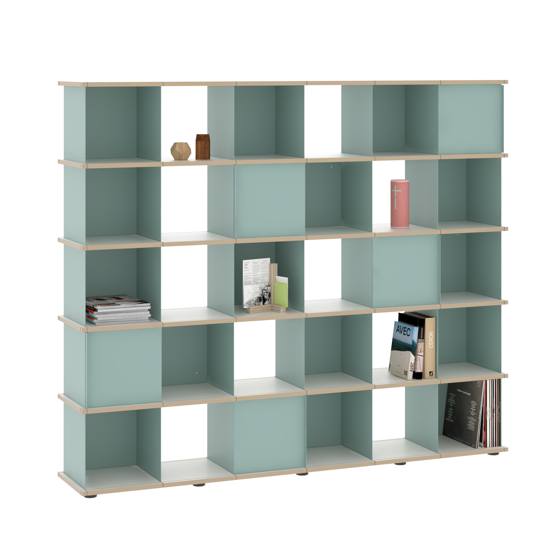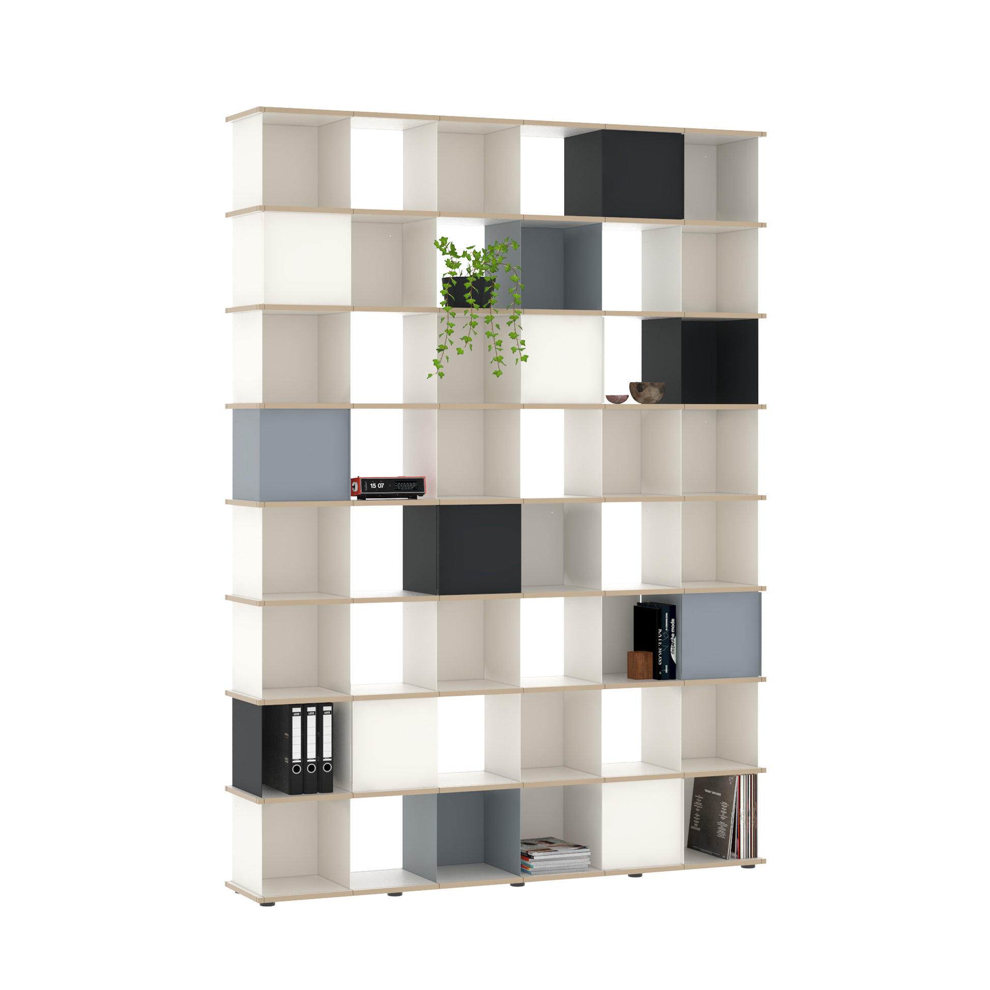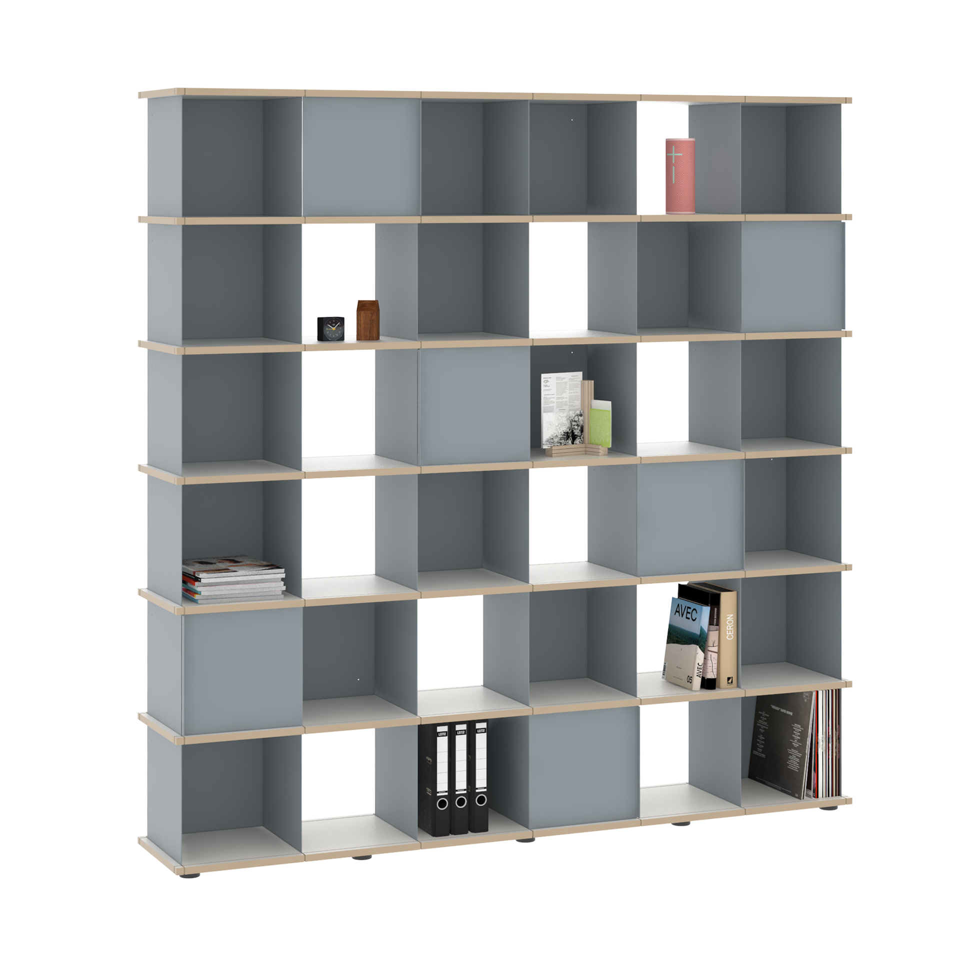 Da sich die Fächer in allen Richtungen in die Nuten der Böden einsetzen lassen, sind die Möbel allseitig und auch wandunabhängig nutzbar. Und dank der verstellbaren Füße an den Sockelböden können Unebenheiten im Fußboden mit einfachen Handgriffen ausgeglichen werden.
