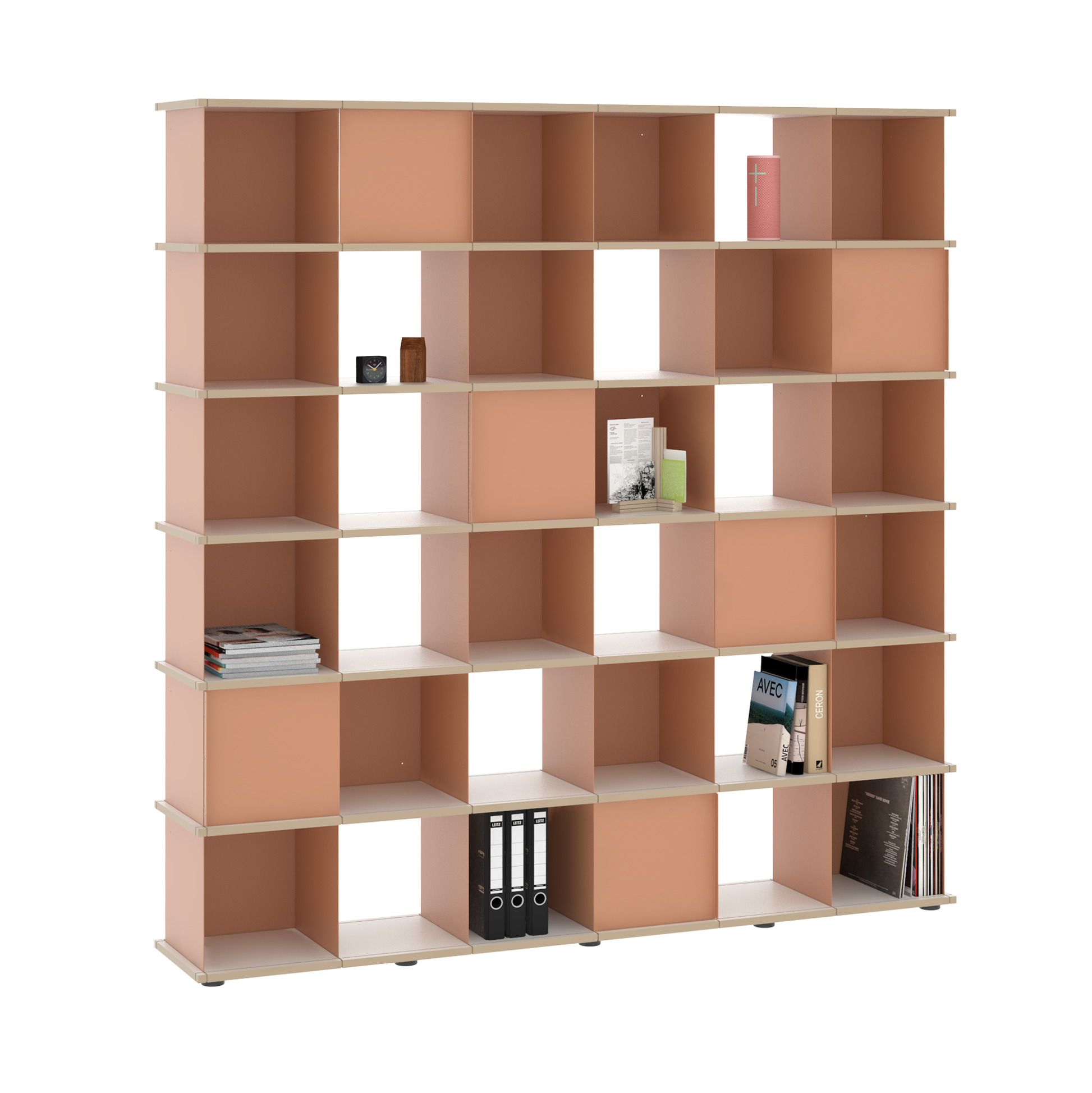 Mit Fächern aus farbig beschichtetem Metall und genuteten Holzböden ist es möglich, vom kleinen Einzelmodul über freistehende Raumteiler bis zur großen Regalwand alles zu bauen. Dafür wird kein Werkzeug benötigt. Man steckt die Regalfächer in der gewünschten Richtung in die Nuten der Böden und baut so Schicht für Schicht in die Höhe.